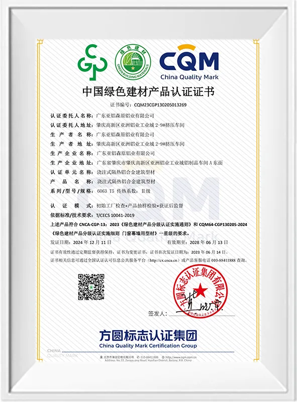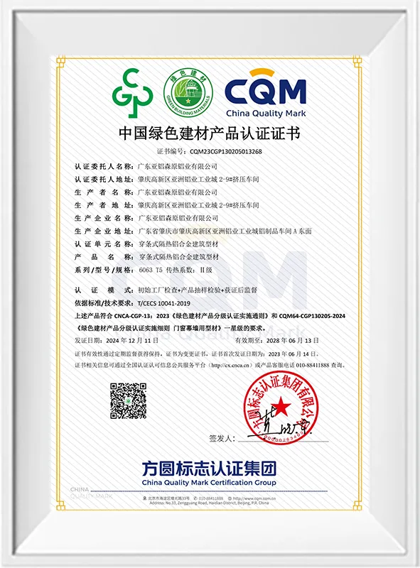 绿色建筑材料认证 – 浇注式隔热型材(一星级)