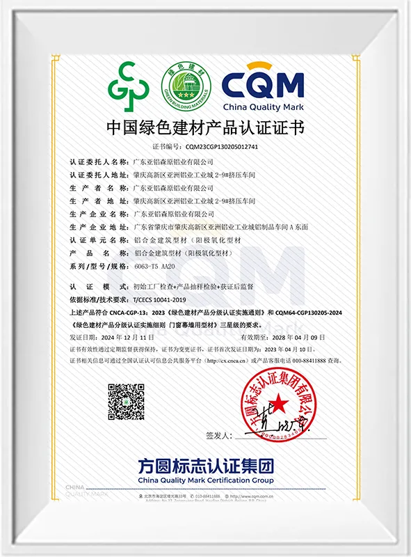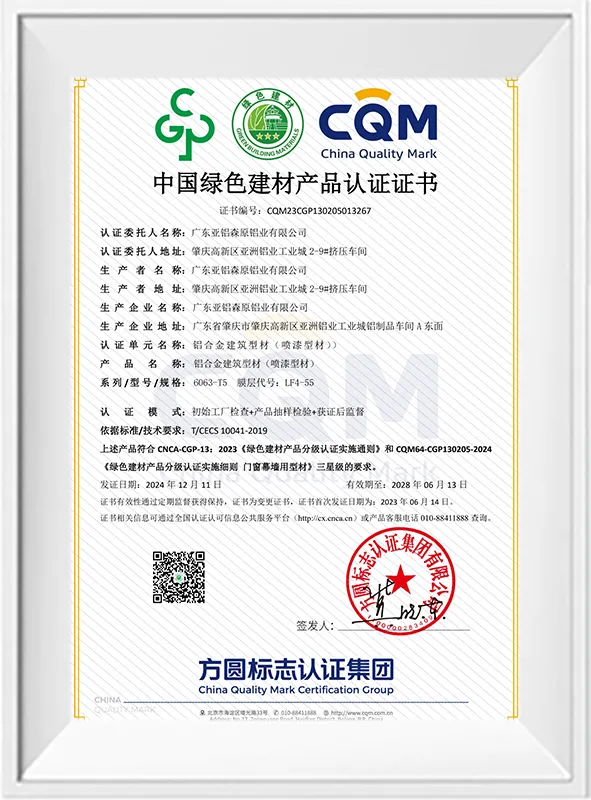 绿色建筑材料认证 – 阳极氧化型材(三星级)
